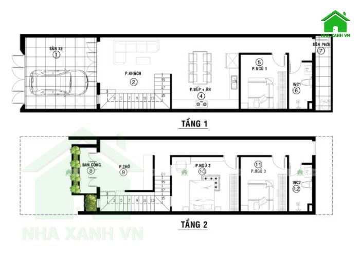Một phương án khác là nhà ống 2 tầng theo phong cách truyền thống. Thiết kế này thường nổi bật với những chi tiết trang trí như ban công, cửa sổ lớn và những đường nét cổ điển duyên dáng. Tầng trệt có thể bao gồm phòng khách và phòng bếp, cùng với một hoặc hai phòng ngủ, trong khi tầng 2 được thiết kế cho không gian nghỉ ngơi và các phòng ngủ.