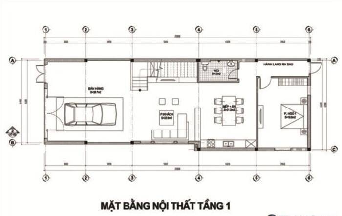 Bản vẽ thiết kế nhà ống 2 tầng 5x20m mang đến hình ảnh một không gian sống hiện đại và tối ưu hóa công năng sử dụng. Tầng trệt được thiết kế với không gian mở, bao gồm phòng khách, khu vực sinh hoạt gia đình và gian bếp hiện đại. Các cửa sổ lớn được bố trí hai bên, giúp ngôi nhà đón ánh sáng tự nhiên và mở rộng tầm nhìn ra bên ngoài.