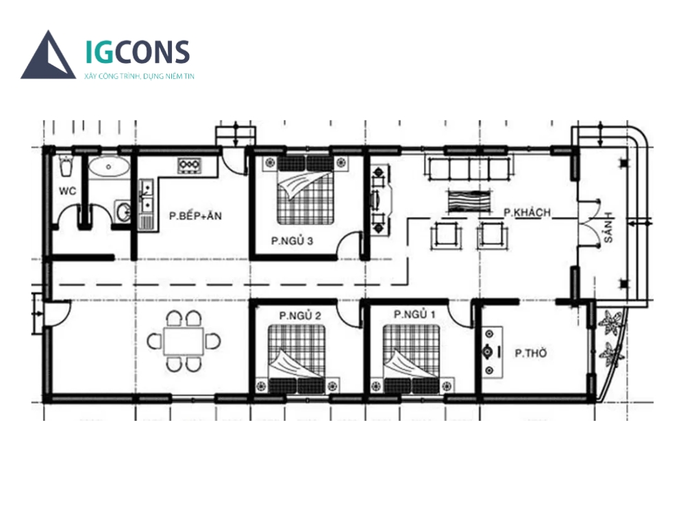Bản vẽ mặt bằng nhà 1 tầng với 3 phòng ngủ được thiết kế tinh tế nhằm tối ưu hóa không gian sống và chức năng sử dụng. Ngôi nhà hướng đến sự kết hợp hài hòa giữa các khu vực, tạo nên một không gian mở lý tưởng với phòng khách, phòng ăn và khu vực bếp liền mạch.