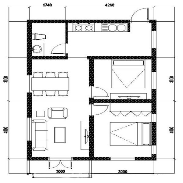 Bản vẽ bao gồm không gian phòng khách rộng rãi, một phòng ngủ, một phòng tắm, và một khu vực bếp. Phòng khách được tận dụng tối đa với cửa sổ lớn đón ánh sáng tự nhiên, mang đến cảm giác thông thoáng và dễ chịu. Phòng ngủ được bố trí ở một bên nhà, mang lại sự yên tĩnh và riêng tư cho người sử dụng. Phòng tắm được thiết kế hiện đại, đầy đủ tiện nghi với bồn tắm và bồn rửa, đáp ứng nhu cầu vệ sinh hàng ngày.