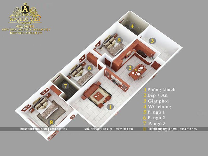Trong thiết kế nội thất, phòng khách được bố trí rộng rãi, thuận tiện cho việc tiếp khách và sinh hoạt gia đình với sofa, bàn trà và các món đồ trang trí. Phòng bếp, nơi nấu nướng chính của gia đình, thường được trang bị đầy đủ với bàn ăn, tủ lạnh và các thiết bị nhà bếp hiện đại. Phòng ngủ cũng được thiết kế để mang lại sự thoải mái, với giường, tủ quần áo và một bàn làm việc nhỏ, phù hợp với nhu cầu nghỉ ngơi và sinh hoạt riêng tư của mỗi thành viên.