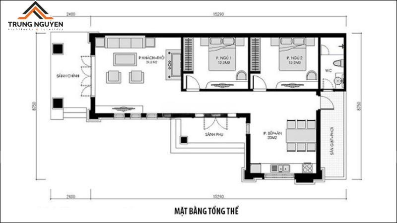 Cấu trúc chung của ngôi nhà gồm hai phần chính: phần chữ L chính và phần chữ L phụ. Phần chính thường bao gồm phòng khách, phòng bếp và một phòng ngủ, với diện tích lớn hơn để đáp ứng nhu cầu sinh hoạt thiết yếu. Phần phụ sẽ chứa hai phòng ngủ và một hoặc hai phòng tắm, có thể được kết nối với phần chính thông qua hành lang hoặc cầu thang, tạo sự liên kết hài hòa cho ngôi nhà.