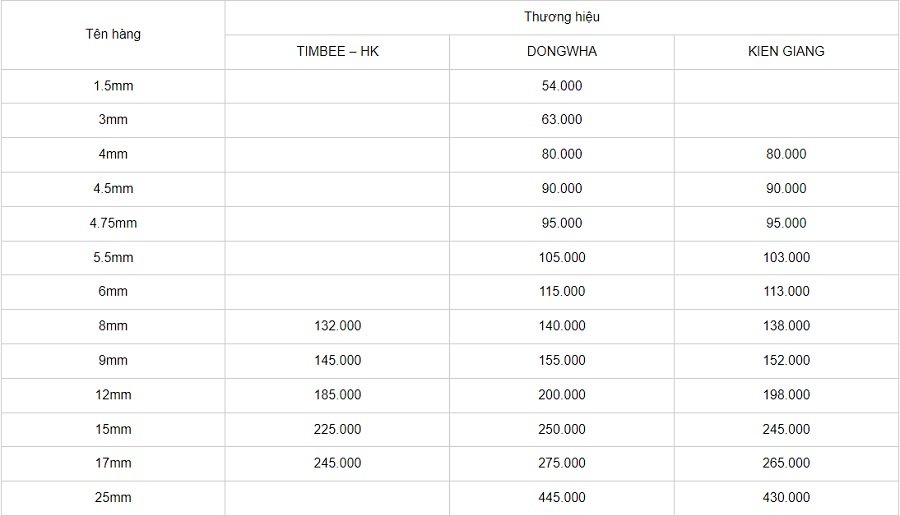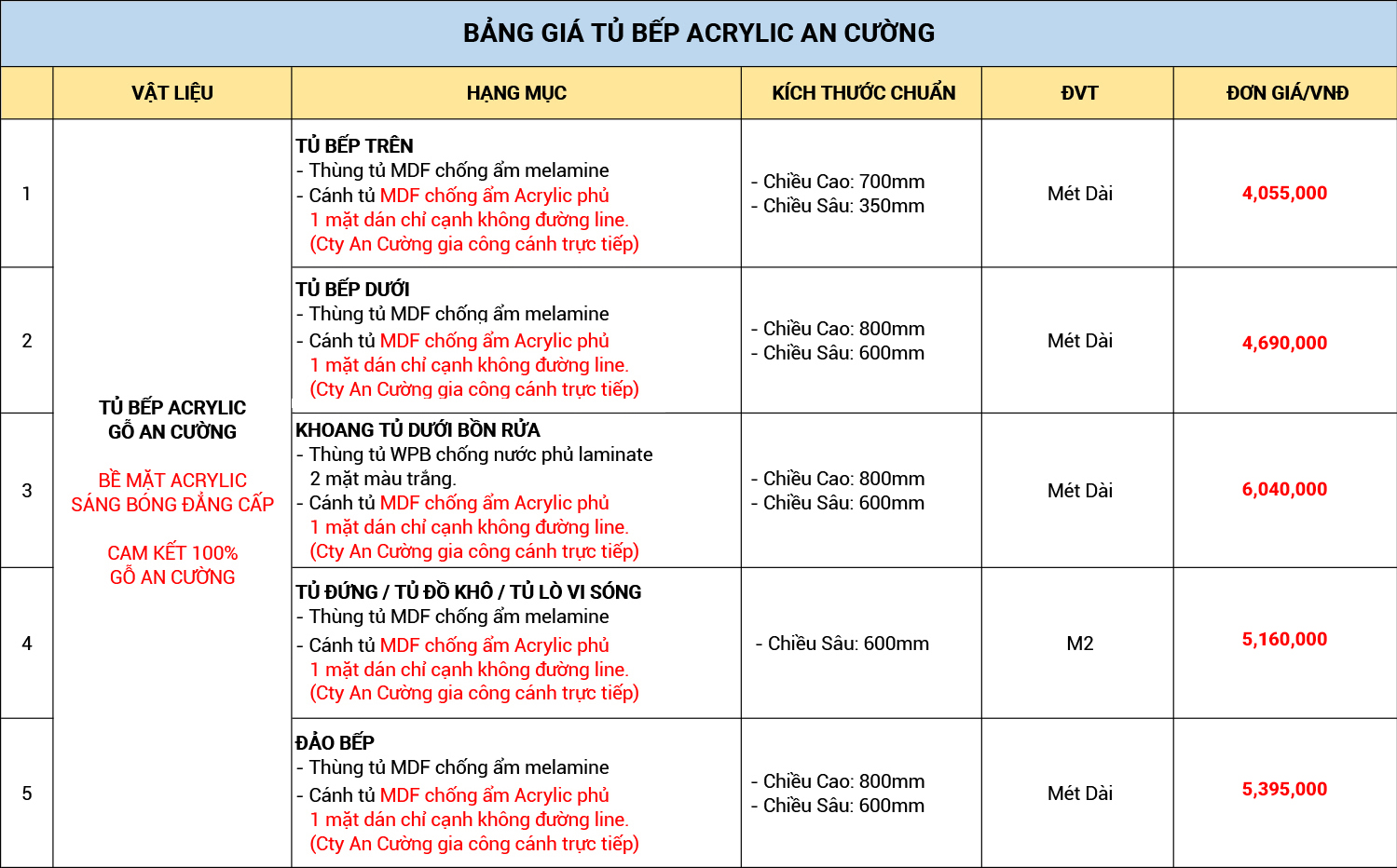 Bảng giá mới nhất cho ván MDF phủ Acrylic từ thương hiệu An Cường thường được công bố trên trang web chính thức của công ty. Người tiêu dùng có thể dễ dàng truy cập trang web này để tìm kiếm thông tin chi tiết về các sản phẩm và giá cả hiện tại. Bảng giá thường bao gồm thông tin về kích thước, màu sắc và giá bán của từng loại ván MDF phủ Acrylic.