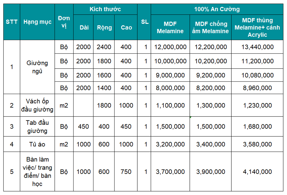 Giá ván MDF phủ Acrylic An Cường thường giao động từ 500.000 đến 1.500.000 đồng mỗi mét vuông, tùy thuộc vào kích thước và chất lượng của sản phẩm. So với các loại ván khác hiện có trên thị trường, giá thành của ván MDF phủ Acrylic được xem là hợp lý. Chẳng hạn, giá ván gỗ tự nhiên có thể dao động từ 2.000.000 đến 5.000.000 đồng mỗi mét vuông, trong khi ván nhựa PVC thường có giá cao hơn, từ 1.000.000 đến 3.000.000 đồng mỗi mét vuông. Điều này cho thấy ván MDF phủ Acrylic là lựa chọn tiết kiệm mà vẫn đảm bảo chất lượng.