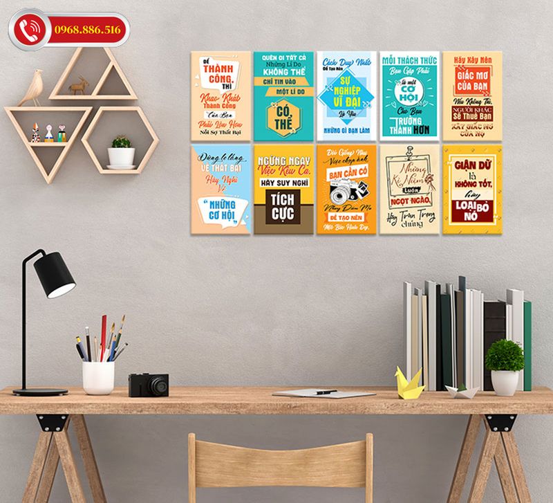 Ngoài ra, việc trang trí bằng tranh ảnh, hoa văn hoặc các đồ vật có hình dẹt được khắc họa theo hình dạng kim cương cũng là những ý tưởng thú vị. Những hình dạng này không chỉ mang lại vẻ đẹp tinh tế mà còn góp phần tăng cường năng lượng lạc quan cho góc làm việc.