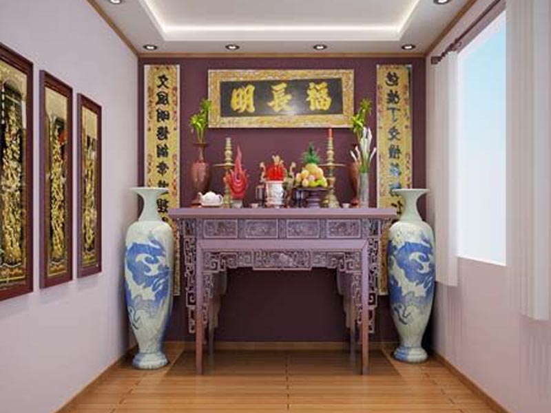 Bên cạnh đó, thiết kế nội thất cũng cần được chú trọng. Bàn thờ nên được đặt ở vị trí trung tâm, trong khi các đồ dùng nội thất khác như ghế, tủ và tranh ảnh cần được sắp xếp một cách cân đối và hài hòa. Màu sắc nhẹ nhàng, trang nhã sẽ tạo ra không khí yên bình và trang nghiêm, thiết thực cho hoạt động thờ cúng.
