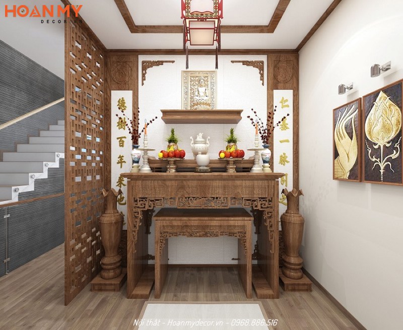 Đừng quên tận dụng không gian tường để treo các bức tranh, ảnh, hoặc đồ trang trí. Không chỉ giúp tạo điểm nhấn cho phòng thờ, việc này cũng giữ cho mặt sàn gọn gàng và thoáng đãng hơn.