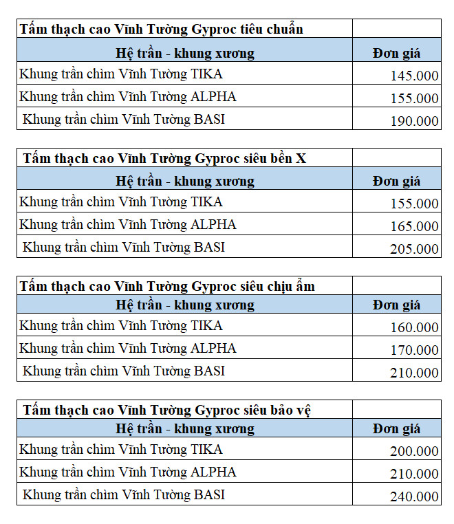 Bảng giá tấm thạch cao của Vĩnh Tường cũng rất phong phú, với các kích thước như 1200×2400, 1220×440 và 600×600, giá từ 160.000 đến 350.000 VNĐ. Đặc biệt, có các loại tấm thạch cao chống ẩm Gyproc với giá từ 160.000 đến 180.000 VNĐ, rất phù hợp cho những khu vực có độ ẩm cao.