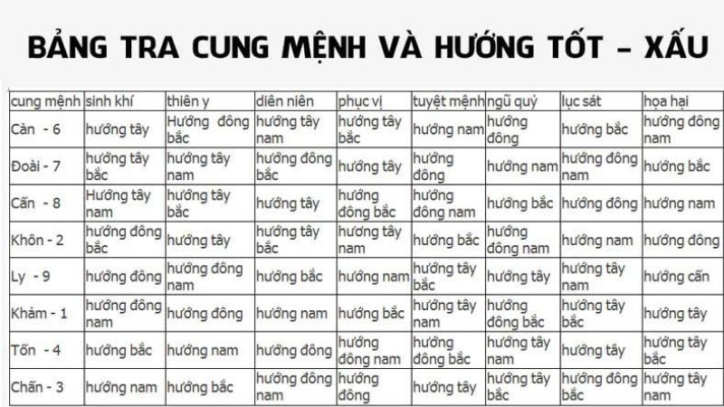 Sau khi có quái số, bạn sẽ xác định cung mệnh của mình. Cung Càn sẽ kết hợp với hướng Tây Nam, Cung Đoài sẽ tương ứng với hướng Đông Bắc, và Cung Cấn sẽ kết hợp với hướng Tây. Điều này nhiều khi quyết định rất lớn đến sự thịnh vượng và hạnh phúc của gia chủ.