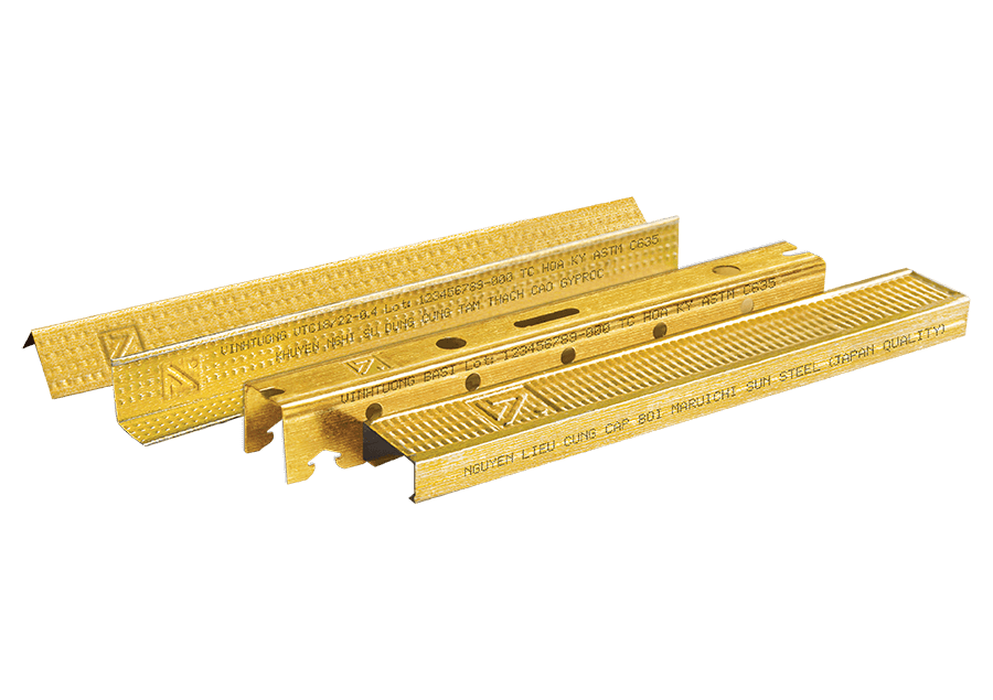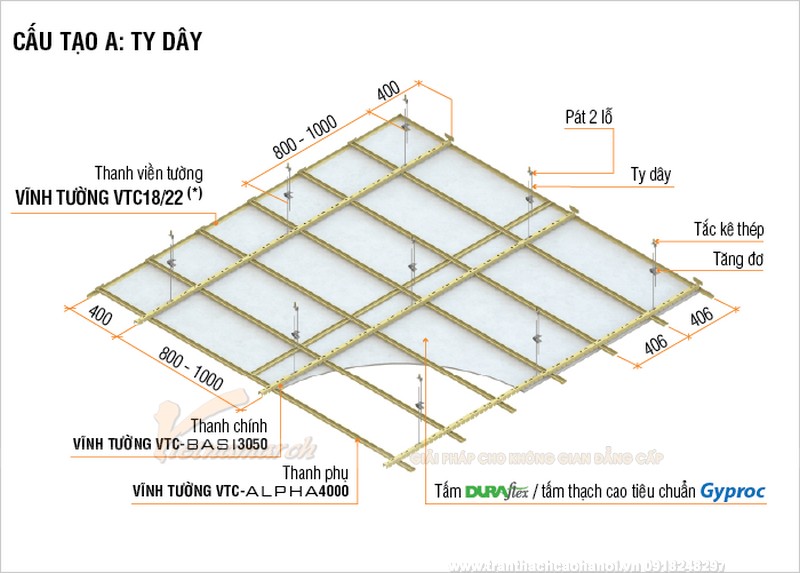 Hệ khung trần này gồm thanh chính VTC3050, có chiều dài 3660mm và độ dày dao động từ 0,73 đến 0,82mm. Đặc biệt, khoảng cách bắn vít được quy định rõ ràng: 150mm cho biên tấm và 240mm cho lòng tấm, giúp việc lắp đặt diễn ra dễ dàng, nhanh chóng.