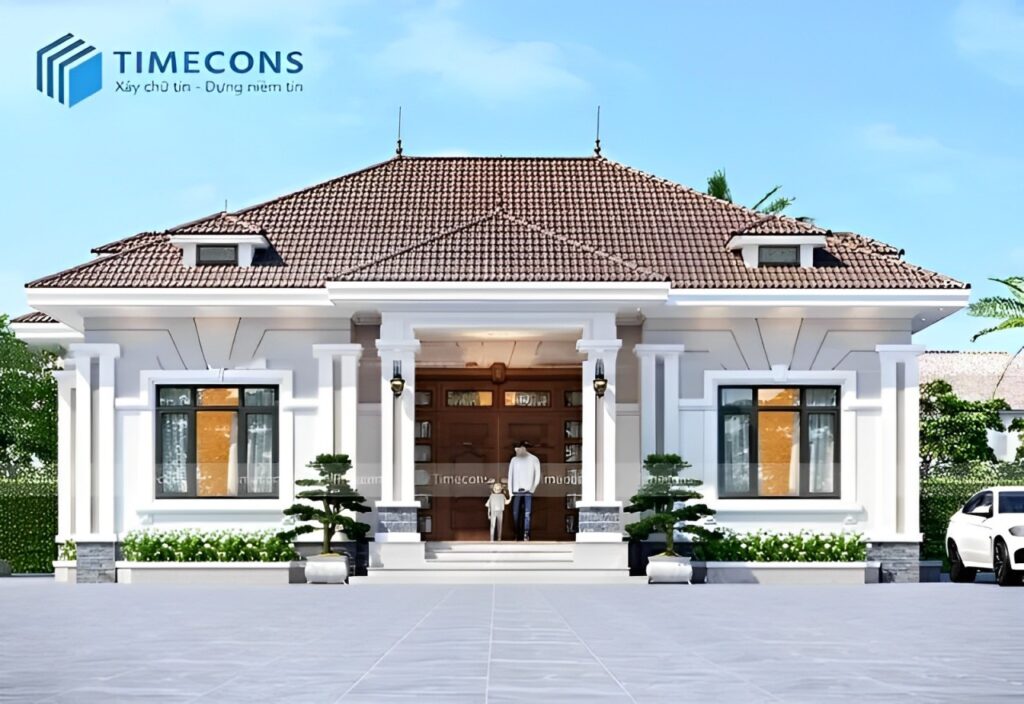 Điểm nổi bật của mẫu nhà vườn cấp 4 này là sự kết hợp hài hòa giữa kiến trúc cổ điển và hiện đại. Mái Nhật thanh thoát và gam màu trắng chủ đạo tạo nên vẻ đẹp thanh lịch. Các họa tiết phù điêu cùng hoa văn tinh tế làm nổi bật không gian sống, mang đậm tính nghệ thuật.