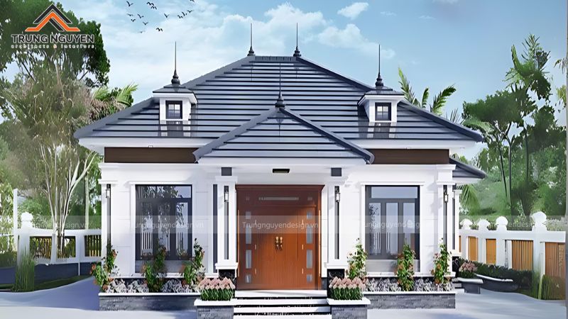 Đặc biệt, nhà vườn một tầng với kiểu mái thái nổi bật giúp tôn lên vẻ đẹp của ngôi nhà. Mặt tiền ngôi nhà thường được sử dụng gam màu trắng chủ đạo, kết hợp cùng hệ mái tối màu, tạo nên sự tương phản hài hòa. Những yếu tố này không chỉ làm tăng tính thẩm mỹ mà còn mang lại cảm giác gần gũi với thiên nhiên xung quanh.