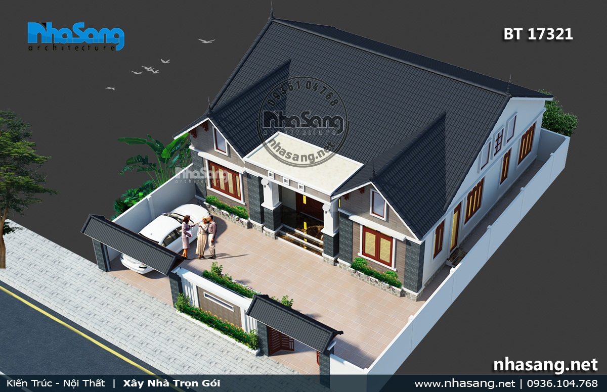 Thiết kế của ngôi nhà mang phong cách hiện đại với những đường nét đơn giản và không gian mở. Sự kết hợp giữa các phòng chức năng như phòng khách, bếp ăn và phòng thờ được bố trí hợp lý, đảm bảo sự tiện nghi trong sinh hoạt hàng ngày. Với không gian sân vườn và gác lửng, mẫu nhà này còn có thể trở thành nơi nghỉ ngơi lý tưởng cho cả gia đình.