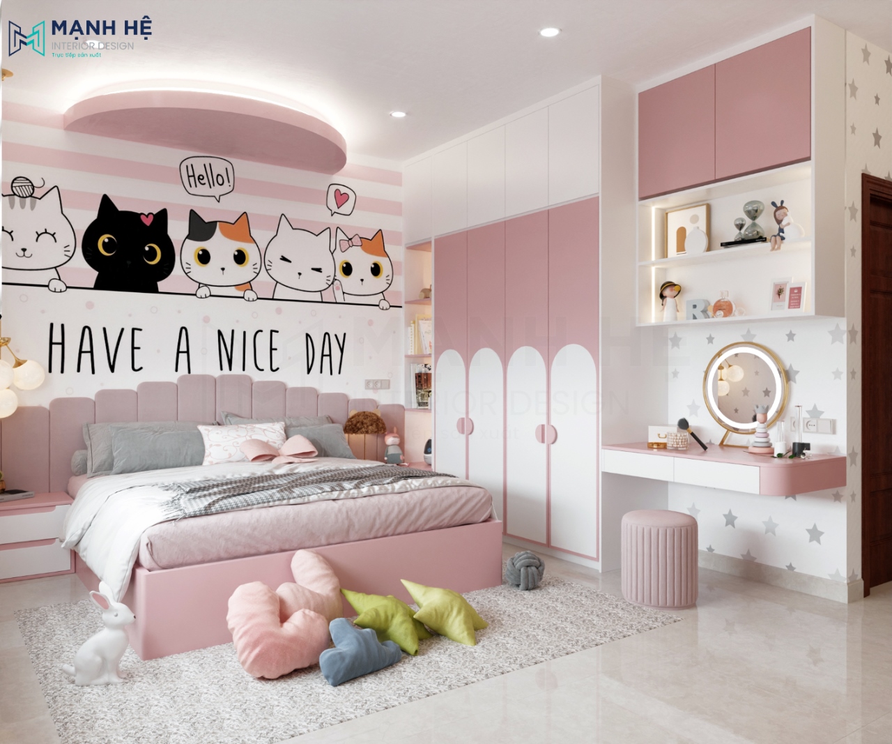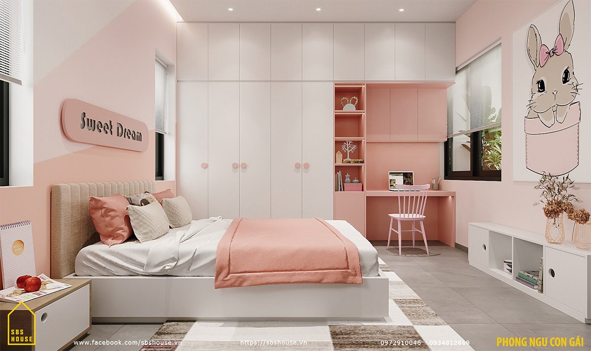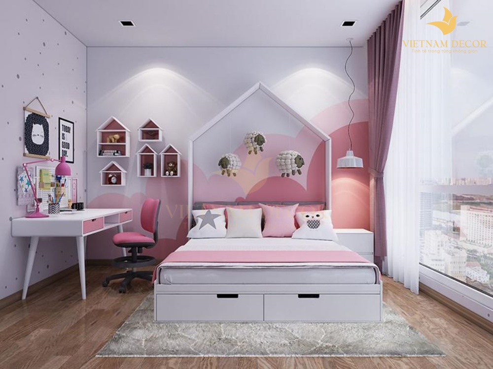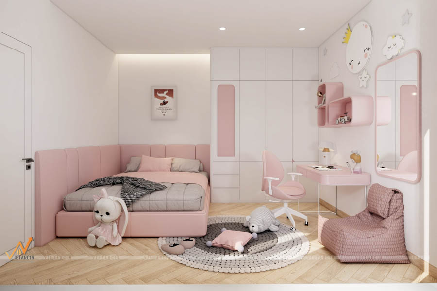 Phòng ngủ bé gái được thiết kế với tone màu trắng hồng không chỉ tạo nên một không gian hài hòa, dễ chịu mà còn phản ánh tính cách dịu dàng của các bé. Màu sắc này giúp căn phòng trở nên ấm áp, tạo cảm giác vui tươi và thư giãn. Các mẫu nội thất dành cho bé gái hiện nay rất đa dạng, từ những thiết kế thông minh đến tối giản, đáp ứng nhu cầu phát triển và sở thích của từng độ tuổi.