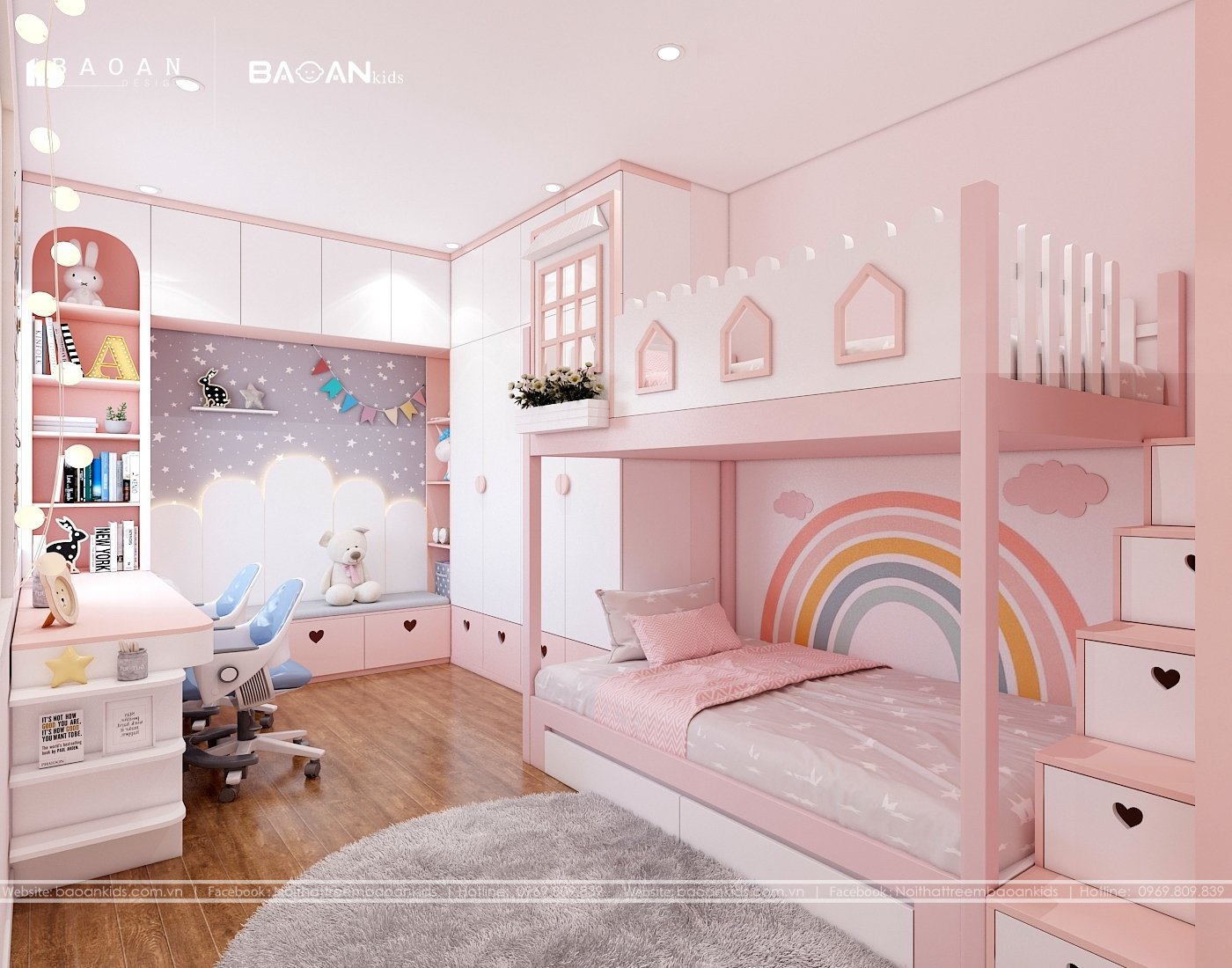 Khi thiết kế phòng ngủ cho bé gái, việc chọn màu sắc và nội thất phù hợp là rất quan trọng. Những tông màu nhẹ nhàng như hồng phấn, trắng và tím nhạt sẽ rất lý tưởng, giúp không gian trở nên dịu dàng và hài hòa. Giường ngủ có đường nét mềm mại, kết hợp với một tủ quần áo có góc bo tròn giúp đảm bảo an toàn cho các bé.