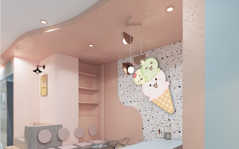 Ngoài ra, màu sắc của trần cũng đóng vai trò quan trọng. Những gam màu sáng như xanh nhạt, trắng sữa hay vàng nhạt thường phù hợp với phong cách hiện đại và trẻ trung, giúp không gian trông thoáng đãng hơn. Đối với quán nhỏ, thiết kế trần phẳng, đơn giản với màu sắc nhẹ nhàng sẽ làm tăng cảm giác rộng rãi cho nơi đây.