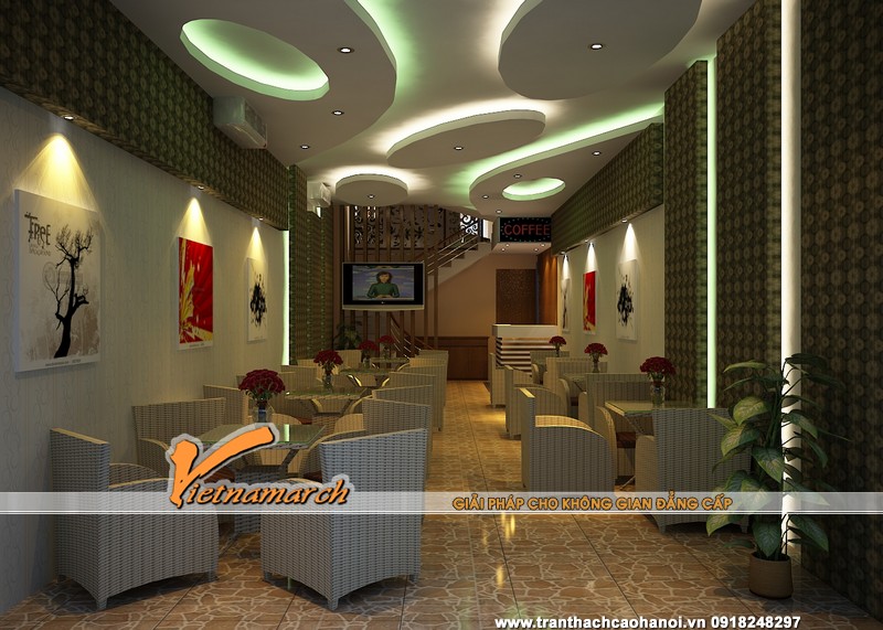Chúng ta cũng thấy rằng việc chọn lựa màu sắc cho trần rất quan trọng. Những màu sáng như xanh nhạt, trắng sữa hay vàng nhạt vừa tạo cảm giác hiện đại, trẻ trung, vừa khiến không gian trở nên rộng rãi hơn. Khi thiết kế trần cafe, điều cần chú ý là màu sắc cần tương đồng với màu tường để tạo sự thống nhất trong không gian.
