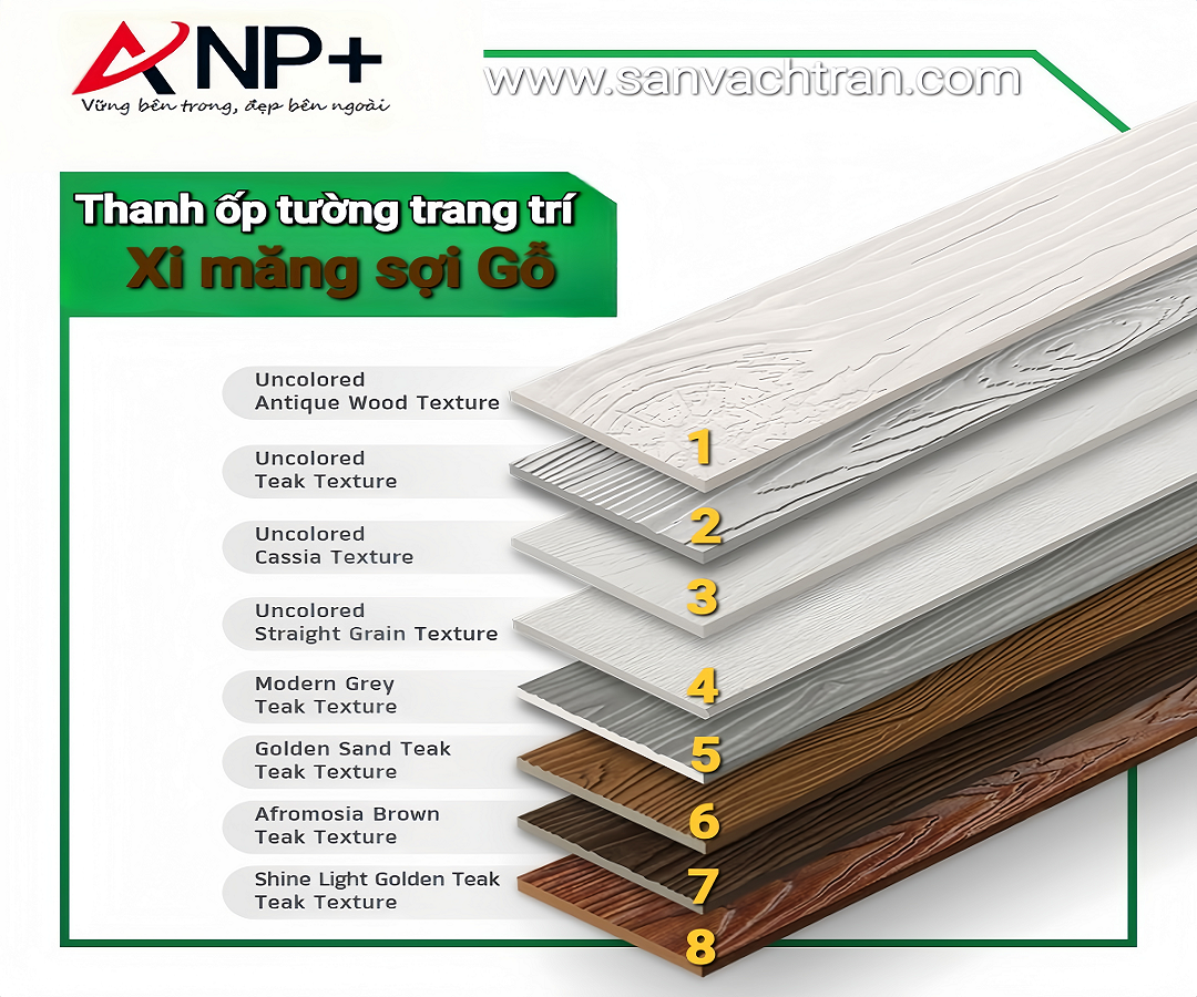 Ngoài ra, tấm xi măng còn được thiết kế với nhiều kiểu dáng và mẫu mã khác nhau, từ giả gỗ cho đến các hoa văn 3D sinh động. Ví dụ, tấm xi măng giả gỗ vân Teak hay vân Thông không chỉ mang đến vẻ đẹp tự nhiên mà còn rất bền bỉ với thời gian. Giá cả cũng rất phải chăng, với các tấm ốp ngoài trời chỉ khoảng 285.000đ cho kích thước 1220 x 2440mm.