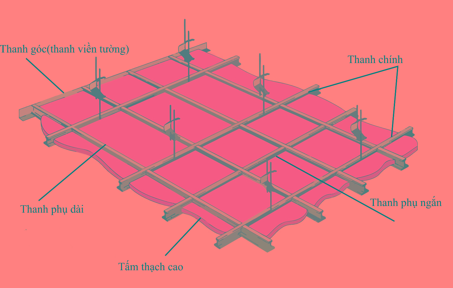 Cấu tạo của trần thạch cao khung chìm gồm ba thành phần chính: khung xương, tấm thạch cao và các vật tư phụ. Khung xương được thiết kế ẩn hoàn toàn phía trên tấm thạch cao, giúp tạo nên một bề mặt trần phẳng và thẩm mỹ hơn. Thành phần khung xương chủ yếu được làm từ kim loại, thường là nhôm và hợp kim nhôm kẽm, giúp tăng cường độ bền và nhẹ nhàng.