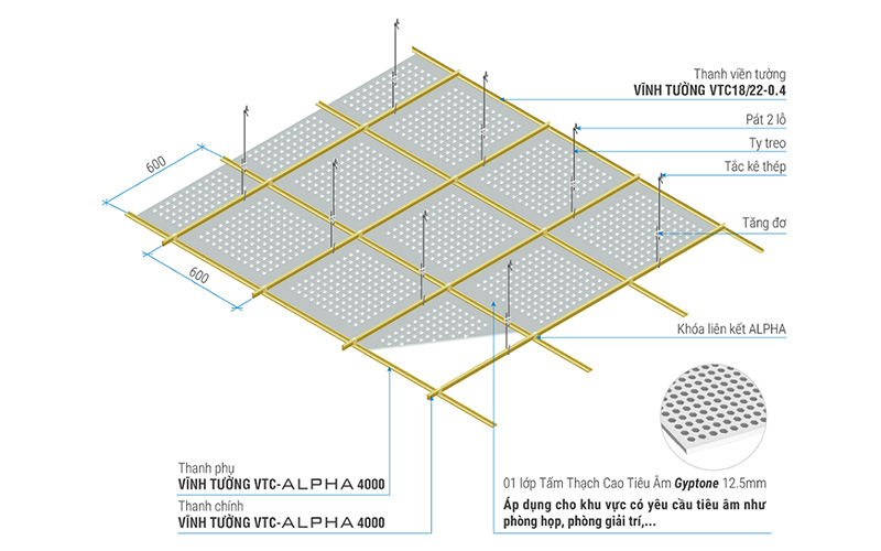 Một trong những sản phẩm tiêu biểu là tấm thạch cao đục lỗ Gyptone, thường được dùng cho cả hệ trần và ốp tường. Kích thước tiêu chuẩn của nó là 1200x2400mm, khá lớn giúp dễ dàng lắp đặt và tiết kiệm thời gian thi công. Đặc biệt, trần thả tiêu âm được thiết kế với cấu trúc khung xương chia ô 60×60, tạo sự đồng bộ và hiện đại cho không gian.