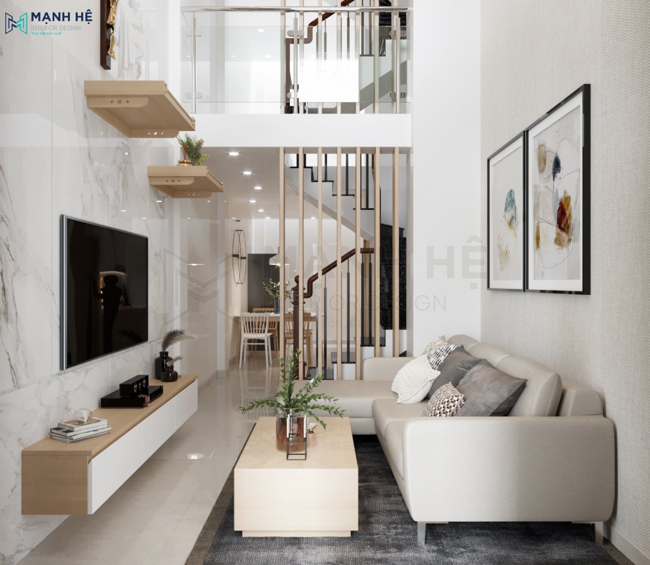 Phong cách trang trí phòng khách 20m2 trong nhà ống hiện đang được ưa chuộng với màu sắc chủ đạo là màu trắng và các gam màu trung tính. Việc lựa chọn màu sắc nhẹ nhàng này không chỉ giúp không gian trở nên rộng rãi hơn mà còn tạo cảm giác bình yên, dễ chịu cho những ai sử dụng.