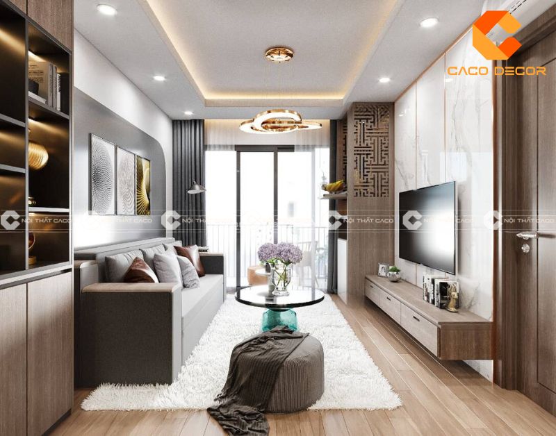 Khi lựa chọn nội thất, bạn nên ưu tiên các sản phẩm bọc da sang trọng, kết hợp cùng màu trắng hoặc ghi xám để tạo nên sự hài hòa. Sàn gỗ sáng màu hoặc gạch men khổ lớn sẽ giúp không gian liền mạch, đồng thời tăng thêm tính thẩm mỹ. Hạn chế sử dụng thảm lớn để không bị chật chội.