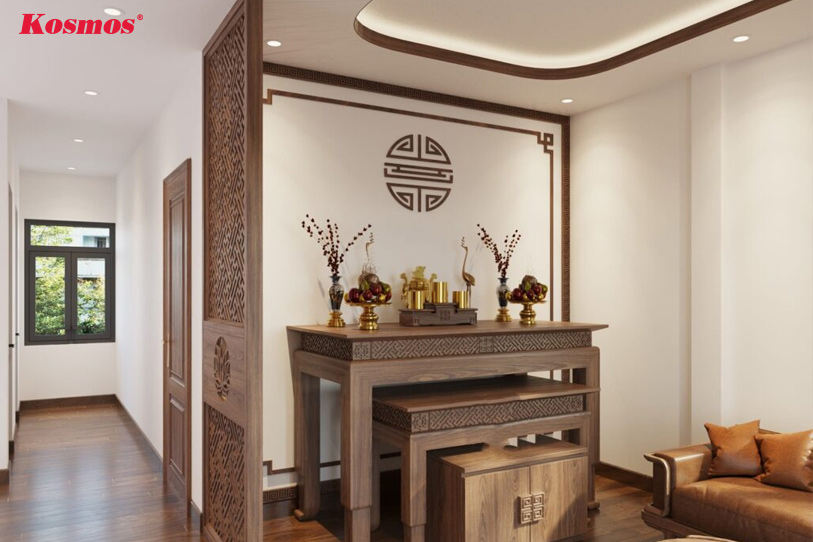 Sử dụng gam màu trung tính trong thiết kế vách ngăn là cách tuyệt vời để hài hòa với các đồ nội thất xung quanh. Những chất liệu như gỗ tự nhiên cao cấp như gỗ gụ, gỗ hương hay MDF phủ Melamine được ưa chuộng vì tính bền bỉ và vẻ đẹp tự nhiên. Đối với những gia chủ mong muốn không gian thờ cúng riêng biệt, việc tạo khối vách liền mạch sẽ mang lại cảm giác ấm cúng và vững chắc.