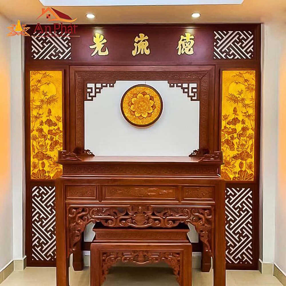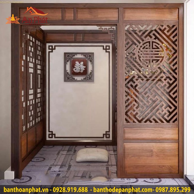 Vách ngăn thường được làm từ chất liệu gỗ tự nhiên hoặc gỗ công nghiệp cao cấp, đảm bảo độ bền và thẩm mỹ. Các mẫu vách ngăn CNC với họa tiết độc đáo như hoa sen, chữ Phúc hay chữ Thọ không chỉ đẹp mà còn mang ý nghĩa phong thủy tốt. Đặc biệt, với các căn hộ diện tích hạn chế, vách ngăn CNC phòng thờ nhỏ là lựa chọn hoàn hảo, tiết kiệm không gian mà vẫn đảm bảo tính thẩm mỹ.
