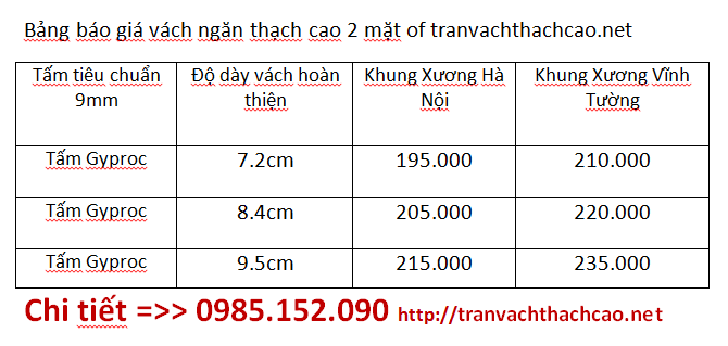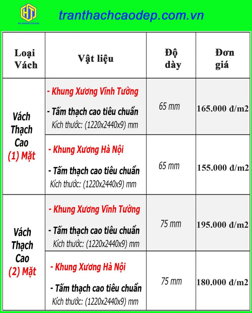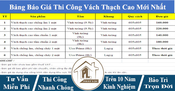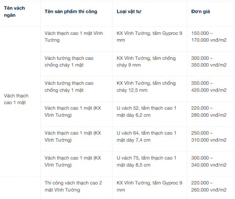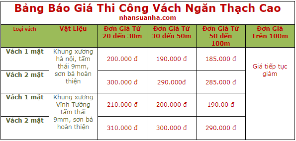 Bảng giá vách ngăn thạch cao hiện nay đang được nhiều người quan tâm, nhất là những ai đang có dự định thi công nội thất. Giá cả dao động từ 150.000đ đến 300.000đ/m², phụ thuộc vào chất lượng khung xương và tấm thạch cao mà bạn lựa chọn.