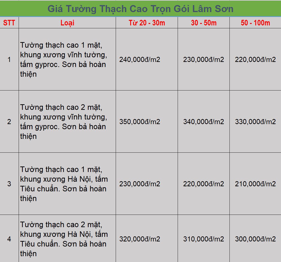 Bên cạnh đó, nếu bạn muốn sử dụng tấm thạch cao chống ẩm hoặc chống cháy, bạn chỉ cần cộng thêm 20.000đ/m2. Tổng mức giá cho các loại vách ngăn thạch cao dao động từ 180.000 đến 380.000đ/m2, tùy thuộc vào từng loại và mức độ thi công. Đặc biệt, với diện tích lớn từ 30 đến 50m2, mức giá sẽ được ưu đãi hơn, chỉ khoảng 200.000đ/m2.