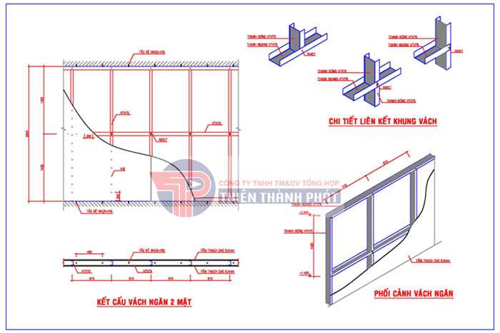 Khung xương thạch cao đóng vai trò then chốt trong việc định hình kết cấu vách ngăn. Thường được làm từ thép mạ nhôm kẽm AZ50, khung này không chỉ chịu lực tốt mà còn đảm bảo độ bền lâu dài. Tấm thạch cao được liên kết vững chắc với khung xương bằng ốc vít chuyên dụng, giúp tăng độ ổn định cho toàn bộ hệ thống.
